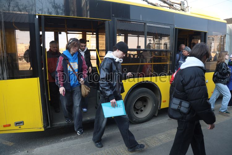 Люди выходят из троллейбуса на остановке общественного транспорта, в Киеве, 23 марта 2026 г. С середины марта стоимость проезда в маршрутных такси Киева выросла на 5 грн. и составляет 20 грн. за поездку. Частные перевозчики отмечают, что повышение тарифа является вынужденным шагом и связано со значительным ростом стоимости дизельного топлива, смазочных масел и импортных запчастей. С 23 марта стоимость проезда на междугородных маршрутах в Киевской области тоже значительно выросла. Фото Ковальчук Виктор / УНИАН