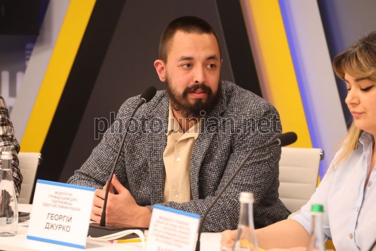 Модератор, общественный деятель, предприниматель, лидер системных решений, адаптировавший гостинично-ресторанную сферу бизнеса под нужды ветеранов и их семей Георгий Джурко во время круглого стола на тему: «Будущее украинского общества во время войны и после победы» в пресс-центре УНИАН в Киеве, 24 марта 2026 г. Фото Ковальчук Виктор / УНИАН