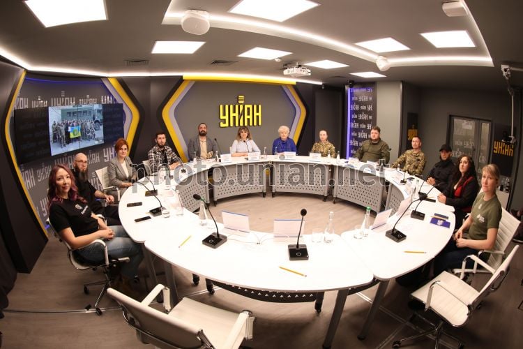 Руководитель департамента психологической подготовки и поддержки в военной школе «Боривітер», супервизор программы реабилитации ветеранов «Компас Героя» Марина Гукасян; ветеран российско-украинской войны, ведущий инструктор и эксперт по психологической подготовке и адаптации военнослужащих (военная школа «Боривітер») «Херсон»; психолог, член союза психотерапевтов Украины, ведущий специалист по психоэмоциональному восстановлению ВГО «Суспільна справа», супруга и мать военного Ася Струтинская; защитник Украины, оборонец Мариуполя (попал в плен после окружения Азовстали, где провел 3,5 года плена, освобожден 2 октября 2025 г.), действующий военнослужащий 12-й бригады "Азов" 1-го корпуса НГУ, проходит реабилитацию в Unbroken (Львов) - Назари, позывной "Вівтар"; модератор, общественный деятель, предприниматель, лидер системных решений, адаптировавший гостинично-ресторанную сферу бизнеса под нужды ветеранов и их семей Георгий Джурко; менеджер по управлению «Вільна» БФ Рокада UNFPA ООН, коуч ICF, волонтер Красного Креста и ведущий специалист по психоэмоциональному восстановлению ВГО «Суспільна справа» Валерия Радченко; ведущий специалист по физической реабилитации ВГО «Суспільна справа» Валентина Ватага; военнослужащая Наталья Мигляс; представитель батальона имени Шейха Мансура - Саид; начальник отдела психологического сопровождения и восстановления управления психологической поддержки персонала Администрации Государственной специальной службы транспорта Максим Киливник; представитель батальона имени Шейха Мансура Абу Юнус; глава группы семей "Пантеон Полеглої Величі", Городское (Берковецкое) кладбище, Сектор Почетных Захоронений 102, жена погибшего Воина Галина Кобзарь; супруга погибшего Героя, Ветеранский фонд "После Службы" Юлия Мовчан во время круглого стола на тему: «Будущее украинского общества во время войны и после победы» в пресс-центре УНИАН в Киеве, 24 марта 2026 г. Фото Ковальчук Виктор / УНИАН