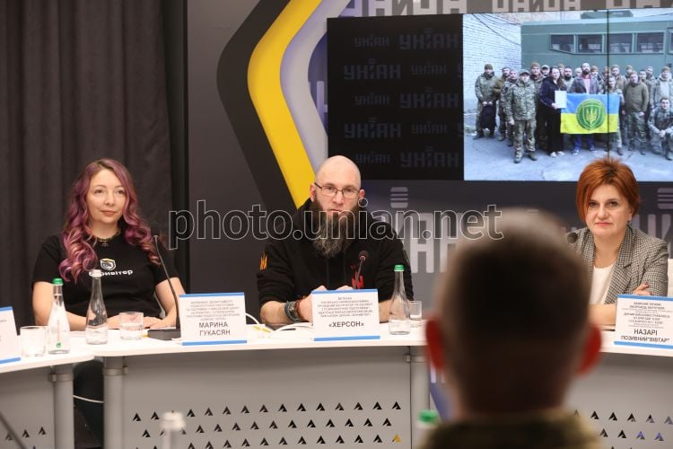 Руководитель департамента психологической подготовки и поддержки в военной школе «Боривітер», супервизор программы реабилитации ветеранов «Компас Героя» Марина Гукасян; ветеран российско-украинской войны, ведущий инструктор и эксперт по психологической подготовке и адаптации военнослужащих (военная школа «Боривітер») «Херсон»; психолог, член союза психотерапевтов Украины, ведущий специалист по психоэмоциональному восстановлению ВГО «Суспільна справа», супруга и мать военного Ася Струтинская во время круглого стола на тему: «Будущее украинского общества во время войны и после победы» в пресс-центре УНИАН в Киеве, 24 марта 2026 г. Фото Ковальчук Виктор / УНИАН