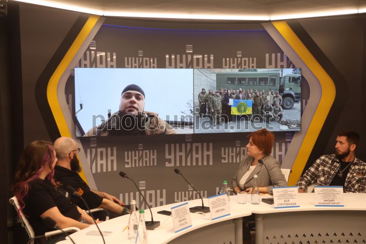 Руководитель департамента психологической подготовки и поддержки в военной школе «Боривітер», супервизор программы реабилитации ветеранов «Компас Героя» Марина Гукасян; ветеран российско-украинской войны, ведущий инструктор и эксперт по психологической подготовке и адаптации военнослужащих (военная школа «Боривітер») «Херсон»; психолог, член союза психотерапевтов Украины, ведущий специалист по психоэмоциональному восстановлению ВГО «Суспільна справа», супруга и мать военного Ася Струтинская; защитник Украины, оборонец Мариуполя (попал в плен после окружения Азовстали, где провел 3,5 года плена, освобожден 2 октября 2025 г.), действующий военнослужащий 12-й бригады "Азов" 1-го корпуса НГУ, проходит реабилитацию в Unbroken (Львов) - Назари, позывной "Вівтар" во время круглого стола на тему: «Будущее украинского общества во время войны и после победы» в пресс-центре УНИАН в Киеве, 24 марта 2026 г. Фото Ковальчук Виктор / УНИАН