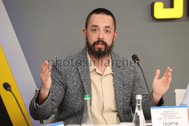 Модератор, общественный деятель, предприниматель, лидер системных решений, адаптировавший гостинично-ресторанную сферу бизнеса под нужды ветеранов и их семей Георгий Джурко во время круглого стола на тему: «Будущее украинского общества во время войны и после победы» в пресс-центре УНИАН в Киеве, 24 марта 2026 г. Фото Ковальчук Виктор / УНИАН