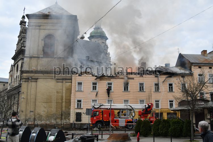 Разрушенная после вражеского обстрела дронами крыша дома в центральной части Львова, 24 марта 2026 г. В результате атаки российских беспилотников в центре Львова повреждены жилые дома. Об этом сообщил мэр города Андрей Садовый. По предварительной информации, пострадало наследие ЮНЕСКО. В результате атаки вражеских беспилотников во Львове произошло возгорание жилых домов на площади Соборной, улице Братьев Рогатинцев и улице Червоной Калины. Также в результате падения обломков БПЛА загорелся частный дом в селе Серники Бибрской территориальной громады. Число пострадавших во Львове увеличилось до семи. Один человек находится в тяжелом состоянии. Фото Тыс Николай / УНИАН