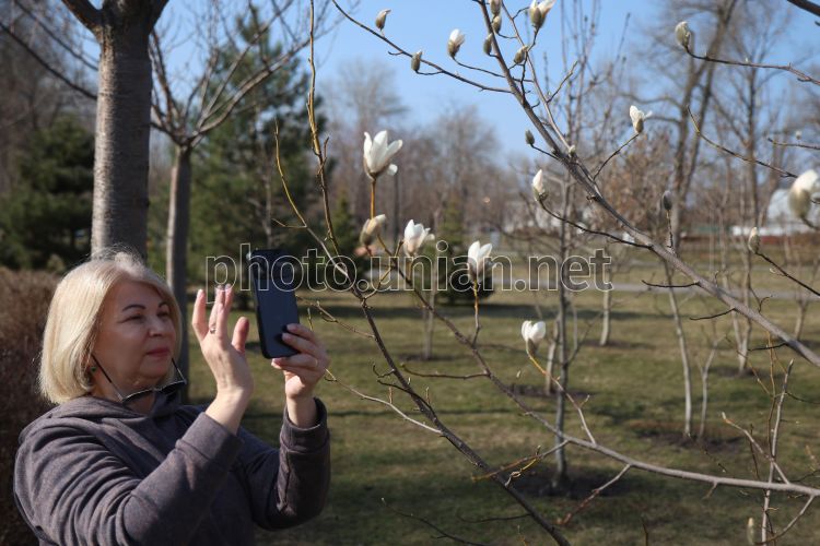 Женщина фотографирует цветущую ветку магнолии, в Киеве, 27 марта 2026 г. Фото Ковальчук Виктор / УНИАН