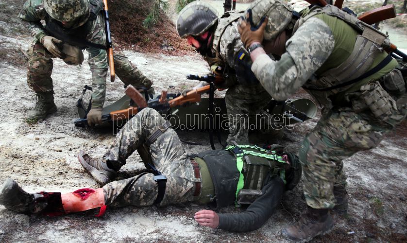 Подготовка к транспортировке "раненого" с поля боя во время военной подготовки военнослужащих-новобранцев на одном из полигонов учебного центра ВСУ в неразглашаемом месте в Украине, 31 марта 2026 года. В одном из учебных центров ВСУ новобранцы проходят военную подготовку, в том числе психологическую полосу и полосу препятствий, получают навыки в тактической медицине, управлении дронами и в борьбе с дронами. Фото Синица Александр / УНИАН