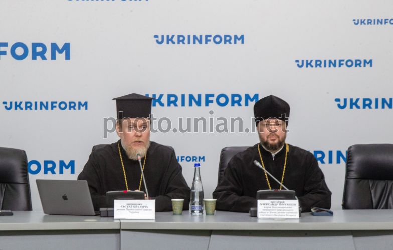 Представитель Православной церкви Украины митрополит Евстратий (Заря) и клирик Владимирского патриаршего кафедрального собора города Киева, пресс-секретарь Святейшего Патриарха Филарета протоиерей Александр Шмуригин во время пресс-конференции на тему «События в украинском православии после упокоения Святейшего Патриарха Филарета: факты и оценки», в Киеве, 1 апреля 2026 г. Официальные церковные представители обнародовали позицию Православной церкви Украины и соратников Святейшего Патриарха Филарета относительно ситуации, которая сложилась в украинском православии. Фото Синица Александр / УНИАН