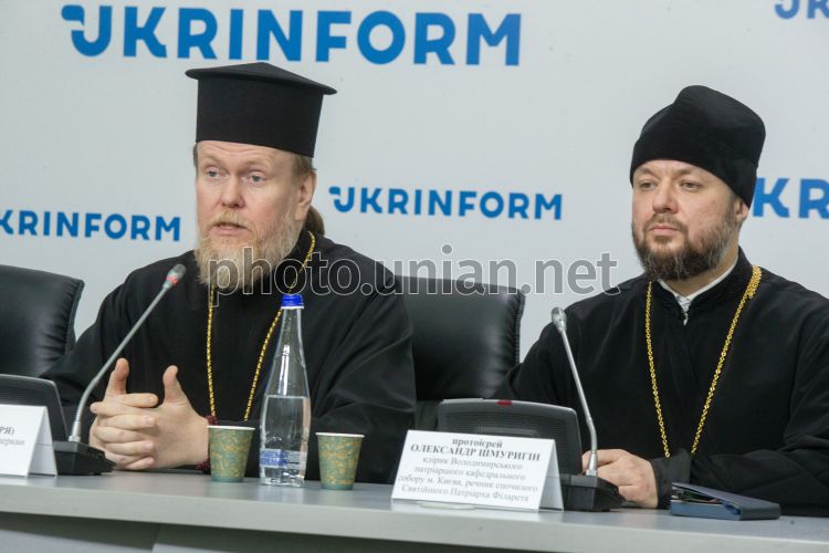 Представитель Православной церкви Украины митрополит Евстратий (Заря) и клирик Владимирского патриаршего кафедрального собора города Киева, пресс-секретарь Святейшего Патриарха Филарета протоиерей Александр Шмуригин во время пресс-конференции на тему «События в украинском православии после упокоения Святейшего Патриарха Филарета: факты и оценки», в Киеве, 1 апреля 2026 г. Официальные церковные представители обнародовали позицию Православной церкви Украины и соратников Святейшего Патриарха Филарета относительно ситуации, которая сложилась в украинском православии. Фото Синица Александр / УНИАН