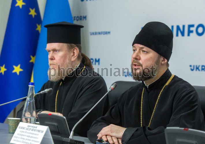 Представитель Православной церкви Украины митрополит Евстратий (Заря) и клирик Владимирского патриаршего кафедрального собора города Киева, пресс-секретарь Святейшего Патриарха Филарета протоиерей Александр Шмуригин во время пресс-конференции на тему «События в украинском православии после упокоения Святейшего Патриарха Филарета: факты и оценки», в Киеве, 1 апреля 2026 г. Официальные церковные представители обнародовали позицию Православной церкви Украины и соратников Святейшего Патриарха Филарета относительно ситуации, которая сложилась в украинском православии. Фото Синица Александр / УНИАН
