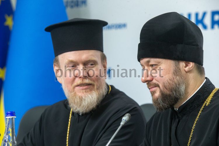 Представитель Православной церкви Украины митрополит Евстратий (Заря) и клирик Владимирского патриаршего кафедрального собора города Киева, пресс-секретарь Святейшего Патриарха Филарета протоиерей Александр Шмуригин во время пресс-конференции на тему «События в украинском православии после упокоения Святейшего Патриарха Филарета: факты и оценки», в Киеве, 1 апреля 2026 г. Официальные церковные представители обнародовали позицию Православной церкви Украины и соратников Святейшего Патриарха Филарета относительно ситуации, которая сложилась в украинском православии. Фото Синица Александр / УНИАН