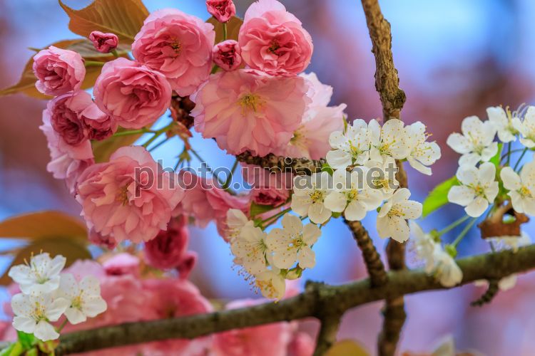 Цветущая ветка сакуры и белые цветы алычи в Ужгороде, 4 апреля 2026 г. Фото Немеш Янош / УНИАН
