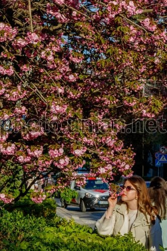 Девушка под цветущей сакурой в Ужгороде, 4 апреля 2026 г. Фото Немеш Янош / УНИАН