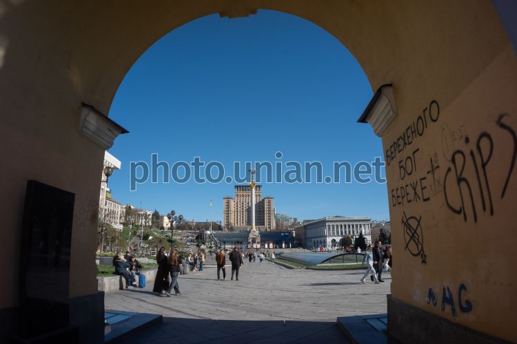 Вид на Монумент Независимости и Майдан Незалежности черед Лядские ворота в Киеве, 5 апреля 2026 г. Фото УНИАН