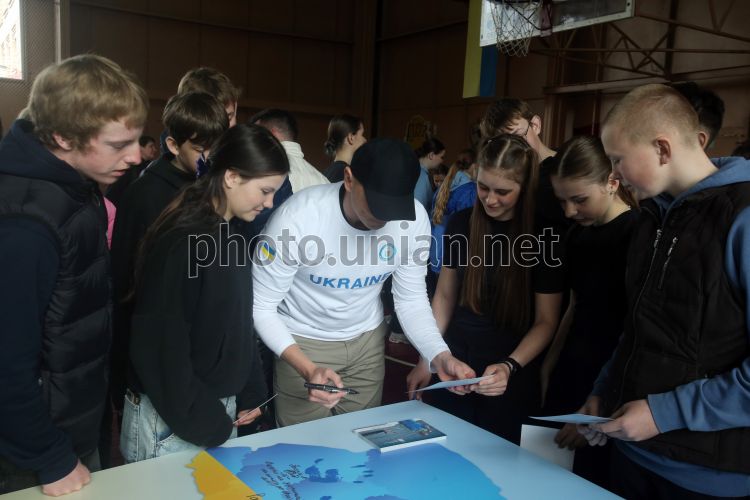 Двухразовый олимпийский чемпион по гребле на каноэ Юрий Чебан раздает автографы во время мероприятия к Международному дню спорта в Киевском спортивном лицее, 8 апреля 2026 г. В мероприятии приняли участие известные спортсмены, олимпийские чемпионы. Лицеисты могли пообщаться с титулованными украинскими олимпийцами, принять участие в олимпийской викторине. В рамках мероприятия провели экологическую акцию – высадили деревья на территории лицея. Фото Синица Александр / УНИАН