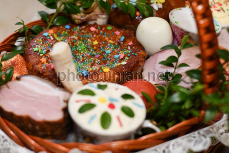 Пасхальный кулич, яйца, мясные блюда в пасхальной корзине, во Львове, 11 апреля 2026 г. Фото Тыс Николай / УНИАН