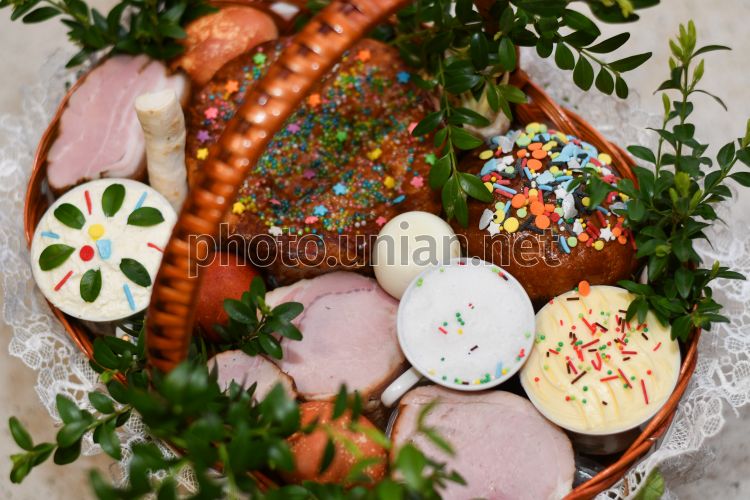 Пасхальный кулич, яйца, мясные блюда в пасхальной корзине, во Львове, 11 апреля 2026 г. Фото Тыс Николай / УНИАН