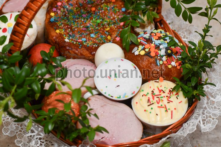 Пасхальный кулич, яйца, мясные блюда в пасхальной корзине, во Львове, 11 апреля 2026 г. Фото Тыс Николай / УНИАН