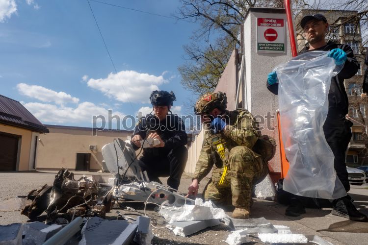 Взрывотехники рассматривают обломки беспилотника "Италмас БМ-5" после обстрела Харькова, 16 апреля 2026 г. Российские войска в ночь на 16 апреля атаковали Харьков ударными беспилотниками. В результате обстрелов возникли пожары, есть раненые. Фото Мариенко Андрей / УНИАН