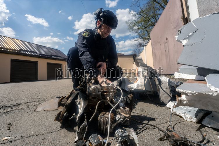 Обломки беспилотника "Италмас БМ-5" после обстрела Харькова, 16 апреля 2026 г. Российские войска в ночь на 16 апреля атаковали Харьков ударными беспилотниками. В результате обстрелов возникли пожары, есть раненые. Фото Мариенко Андрей / УНИАН