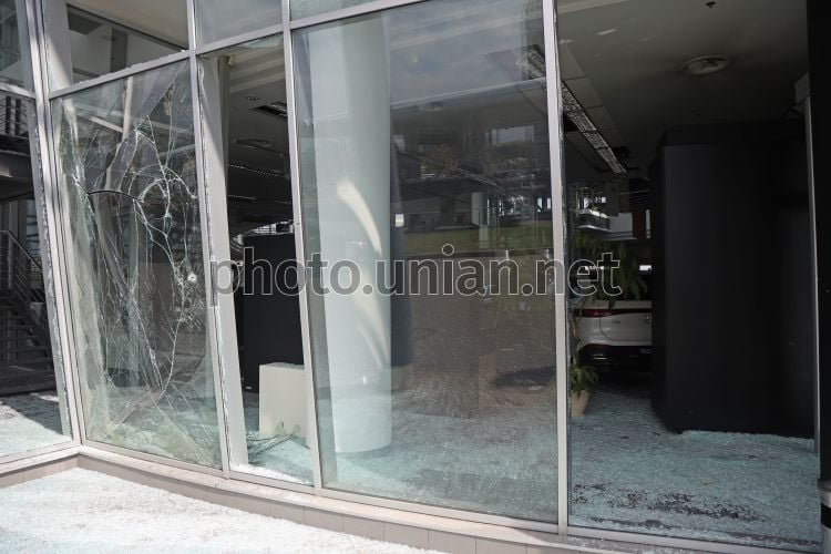 Поврежденное в результате ракетной атаки фасадное остекленение в здании автосалона в Оболонском районе Киева, 16 апреля 2026 г. В ночь на 16 апреля Россия в очередной раз атаковала Киев. Враг запустил по столице баллистические ракеты. В результате атаки погибли 4 человека, среди которых 12-летний мальчик. Зафиксированы разрушения в Подольском, Оболонском, Шевченковском и Деснянском районах. В Оболонском районе произошло возгорание припаркованных автомобилей, повреждено рядом расположенное складское здание, шиномонтаж и здание магазина. Фото Ковальчук Виктор / УНИАН