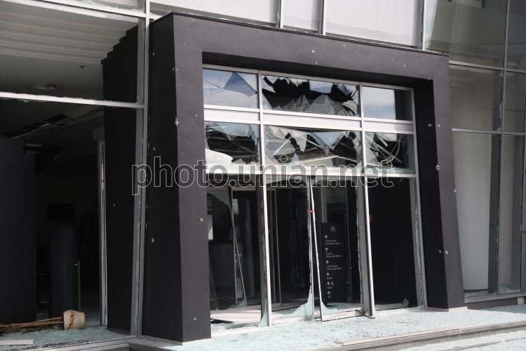 Поврежденное в результате ракетной атаки фасадное остекленение в здании в Оболонском районе Киева, 16 апреля 2026 г. В ночь на 16 апреля Россия в очередной раз атаковала Киев. Враг запустил по столице баллистические ракеты. В результате атаки погибли 4 человека, среди которых 12-летний мальчик. Зафиксированы разрушения в Подольском, Оболонском, Шевченковском и Деснянском районах. В Оболонском районе произошло возгорание припаркованных автомобилей, повреждено рядом расположенное складское здание, шиномонтаж и здание магазина. Фото Ковальчук Виктор / УНИАН