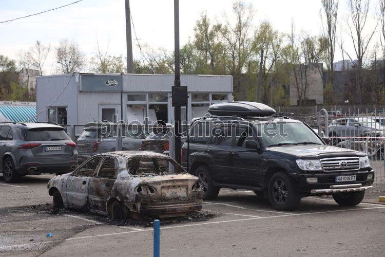 Сгоревший в результате ракетной атаки автомобиль в Оболонском районе Киева, 16 апреля 2026 г. В ночь на 16 апреля Россия в очередной раз атаковала Киев. Враг запустил по столице баллистические ракеты. В результате атаки погибли 4 человека, среди которых 12-летний мальчик. Зафиксированы разрушения в Подольском, Оболонском, Шевченковском и Деснянском районах. В Оболонском районе произошло возгорание припаркованных автомобилей, повреждено рядом расположенное складское здание, шиномонтаж и здание магазина. Фото Ковальчук Виктор / УНИАН
