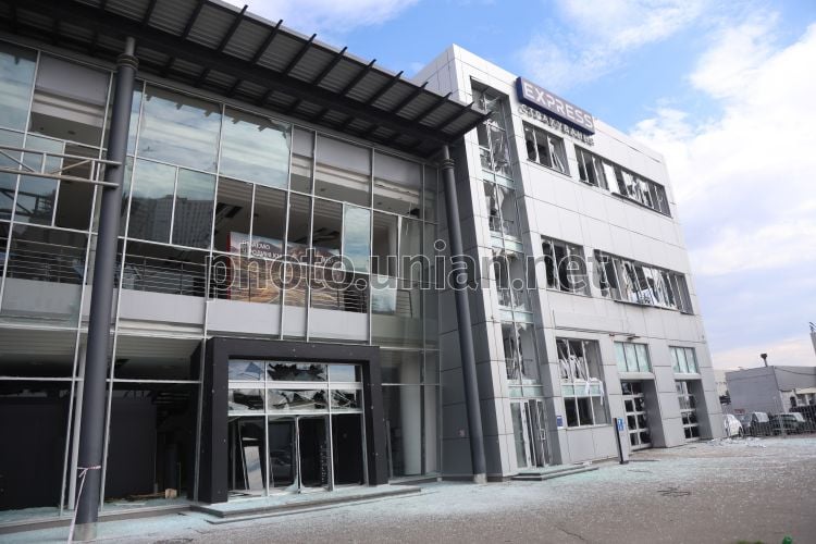 Поврежденное в результате ракетной атаки фасадное остекленение в здании в Оболонском районе Киева, 16 апреля 2026 г. В ночь на 16 апреля Россия в очередной раз атаковала Киев. Враг запустил по столице баллистические ракеты. В результате атаки погибли 4 человека, среди которых 12-летний мальчик. Зафиксированы разрушения в Подольском, Оболонском, Шевченковском и Деснянском районах. В Оболонском районе произошло возгорание припаркованных автомобилей, повреждено рядом расположенное складское здание, шиномонтаж и здание магазина. Фото Ковальчук Виктор / УНИАН