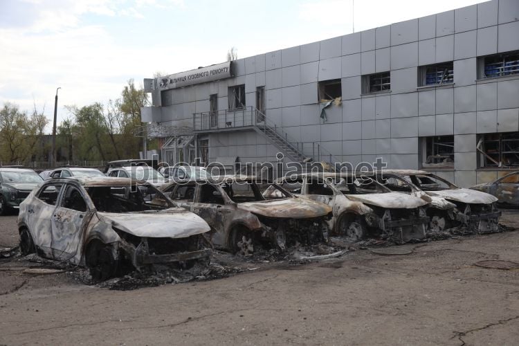 Сгоревшие в результате ракетной атаки автомобили в Оболонском районе Киева, 16 апреля 2026 г. В ночь на 16 апреля Россия в очередной раз атаковала Киев. Враг запустил по столице баллистические ракеты. В результате атаки погибли 4 человека, среди которых 12-летний мальчик. Зафиксированы разрушения в Подольском, Оболонском, Шевченковском и Деснянском районах. В Оболонском районе произошло возгорание припаркованных автомобилей, повреждено рядом расположенное складское здание, шиномонтаж и здание магазина. Фото Ковальчук Виктор / УНИАН