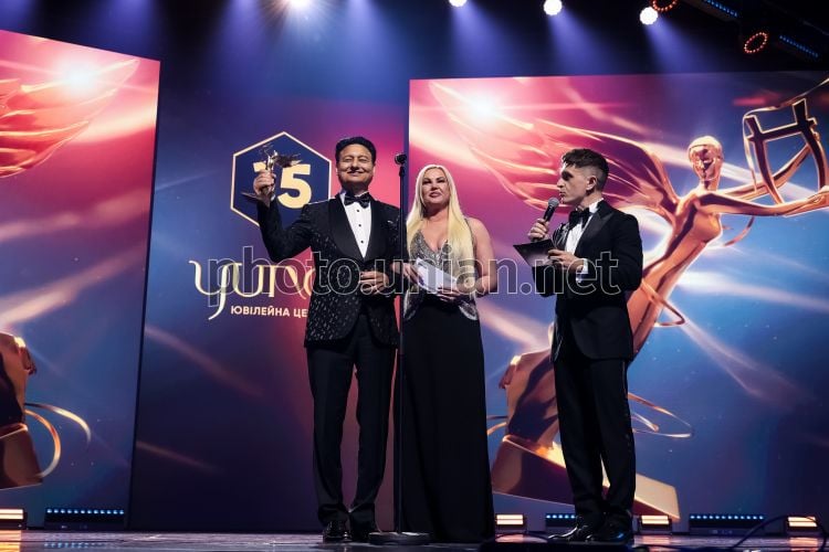 Бизнесмен Мохаммад Захур, певица Камалия (Kamaliya) и ведущий Анатолий Анатолич во время 15-й церемонии награждения Национальной музыкальной премии YUNA, в Киеве, 15 апреля 2026 г. Фото Горлушко Вальдемар / УНИАН