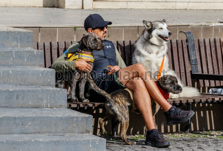 Мужчина с собаками отдыхает на скамейке в центре Ужгорода, 19 апреля 2026 г. Фото Немеш Янош / УНИАН