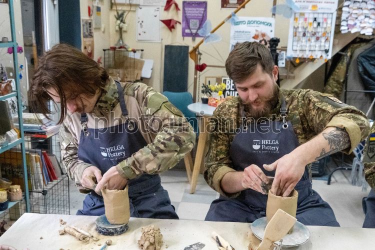 Военнослужащие лепят из глины во время занятия по арт-терапии в Харькове, 24 апреля 2026 г. Военнослужащие 13-й бригады НГУ "Хартия" и 17-й Полтавской бригады НГУ "Рейд" приняли участие в занятии по арт-терапии, а именно гончарство. Это одна из форм психологического обновления после выполнения боевых задач. Во время занятия бойцы работали с глиной, создавая простые изделия – от посуды до декоративных фигур. Такая деятельность помогает снизить уровень стресса, восстановить концентрацию и эмоциональное равновесие. Подобные инициативы направлены на поддержку ментального здоровья военнослужащих. Фото Мариенко Андрей / УНИАН