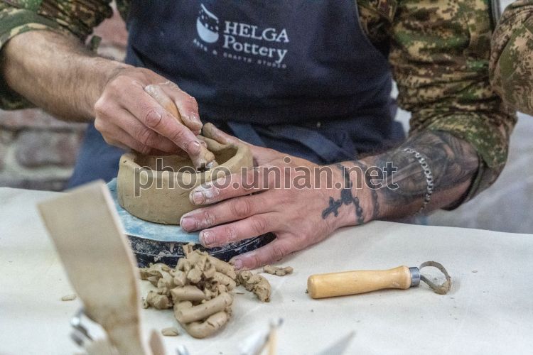 Военнослужащий лепит из глины во время занятия по арт-терапии в Харькове, 24 апреля 2026 г. Военнослужащие 13-й бригады НГУ "Хартия" и 17-й Полтавской бригады НГУ "Рейд" приняли участие в занятии по арт-терапии, а именно гончарство. Это одна из форм психологического обновления после выполнения боевых задач. Во время занятия бойцы работали с глиной, создавая простые изделия – от посуды до декоративных фигур. Такая деятельность помогает снизить уровень стресса, восстановить концентрацию и эмоциональное равновесие. Подобные инициативы направлены на поддержку ментального здоровья военнослужащих. Фото Мариенко Андрей / УНИАН