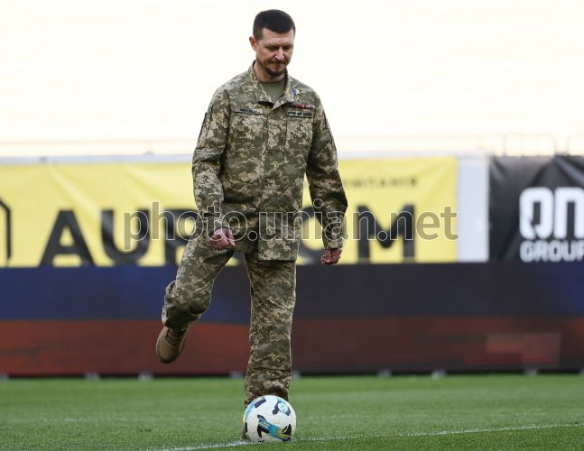 Герой Украины, военнослужащий 103-й отдельной бригады Сил ТрО ВСУ Любомир Микало нанес первый символический удар по мячу перед началом матча 25-го тура Чемпионата Украины среди команд УПЛ (Премьер-лига) по футболу между ФК «Рух» (Львов) – ФК «Карпаты» (Львов), на стадионе «Арена Львов», 25 апреля 2026 г. Матч закончился со счетом 0:3 в пользу ФК "Карпаты". Фото Кравс Евгений / УНИАН