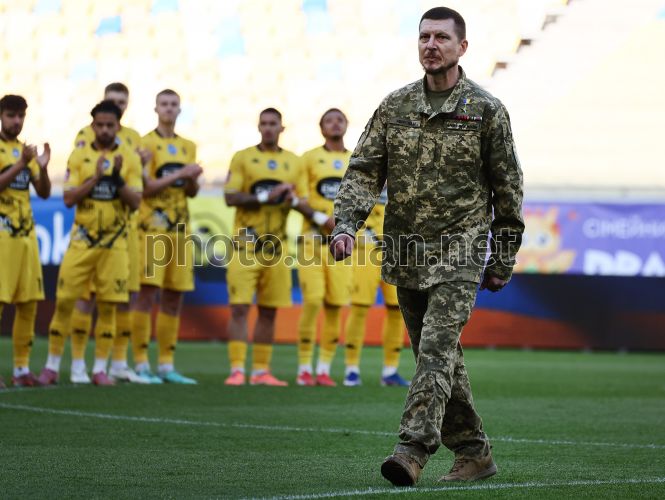 Герой Украины, военнослужащий 103-й отдельной бригады Сил ТрО ВСУ Любомир Микало нанес первый символический удар по мячу перед началом матча 25-го тура Чемпионата Украины среди команд УПЛ (Премьер-лига) по футболу между ФК «Рух» (Львов) – ФК «Карпаты» (Львов), на стадионе «Арена Львов», 25 апреля 2026 г. Матч закончился со счетом 0:3 в пользу ФК "Карпаты". Фото Кравс Евгений / УНИАН