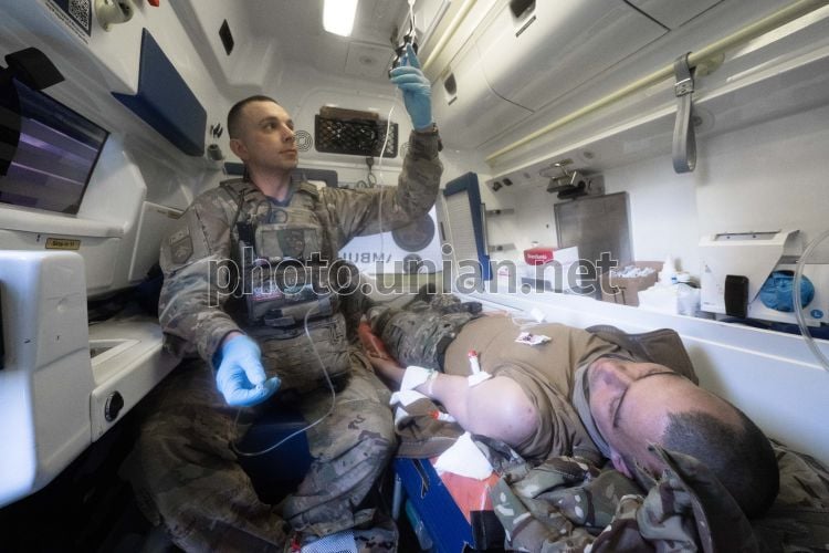 Медицинский работник медпункта 13-й бригады Национальной гвардии Украины «Хартия» оказывает медицинскую помощь военнослужащему в зоне выполнения боевых заданий в Харьковской области, 27 апреля 2026 г. В медпункте бойцы получают необходимую помощь и проходят первичное медицинское осмотр у профессиональных военных медиков. Работа направлена на быстрое реагирование на медицинские нужды личного состава. Фото Мариенко Андрей / УНИАН