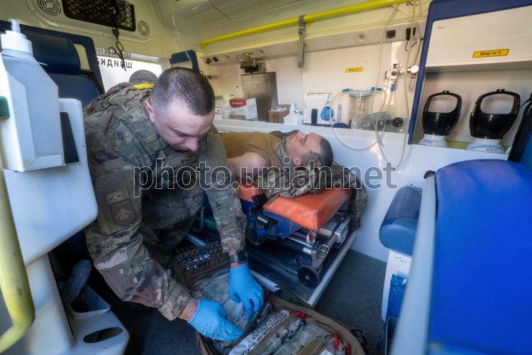 Медицинский работник медпункта 13-й бригады Национальной гвардии Украины «Хартия» оказывает медицинскую помощь военнослужащему в зоне выполнения боевых заданий в Харьковской области, 27 апреля 2026 г. В медпункте бойцы получают необходимую помощь и проходят первичное медицинское осмотр у профессиональных военных медиков. Работа направлена на быстрое реагирование на медицинские нужды личного состава. Фото Мариенко Андрей / УНИАН