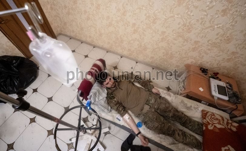 Раненый военнослужащий в медпункте13-й бригады Национальной гвардии Украины «Хартия» в зоне выполнения боевых заданий в Харьковской области, 27 апреля 2026 г. В медпункте бойцы получают необходимую помощь и проходят первичное медицинское осмотр у профессиональных военных медиков. Работа направлена на быстрое реагирование на медицинские нужды личного состава. Фото Мариенко Андрей / УНИАН