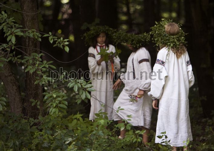 Девушки с венками на голове в вышиванках во время празднования Ивана Купала в Києве, в воскресенье, 6 июля 2008 г. В этот день в Музее народной архитектуры и быта Украины в Пирогово прошло празднование этого народного языческого праздника, который по старому стилю отмечают в ночь с 21 на 22 июня (с 6 на 7 июля по новому стилю). Его главные атрибуты - Купало и Марена. К этому празднику молодежь предварительно старательно готовилась: делали чучело, готовили деревца (называли их ”Мареной” или ”Купалом”), плели из живых цветов венки, собирали хворост, готовили шары соломы для костра. По традиции, Купало и Марена - это две украшенные цветами ветки, похожие на человеческие фигуры. Вокруг чучел молодежь водит хороводы и поет ритуальные купальские песни. Фото Сергея Светлицкого / УНИАН