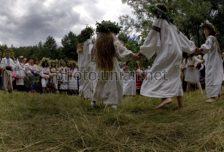 Молодежь ведет хоровод во время празднования Ивана Купала в Києве , в воскресенье, 6 июля 2008 г. В этот день в Музее народной архитектуры и быта Украины в Пирогово прошло празднование этого народного языческого праздника, который по старому стилю отмечают в ночь с 21 на 22 июня (с 6 на 7 июля по новому стилю). Его главные атрибуты - Купало и Марена. К этому празднику молодежь предварительно старательно готовилась: делали чучело, готовили деревца (называли их ”Мареной” или ”Купалом”), плели из живых цветов венки, собирали хворост, готовили шары соломы для костра. По традиции, Купало и Марена - это две украшенные цветами ветки, похожие на человеческие фигуры. Вокруг чучел молодежь водит хороводы и поет ритуальные купальские песни. Фото Сергея Светлицкого / УНИАН