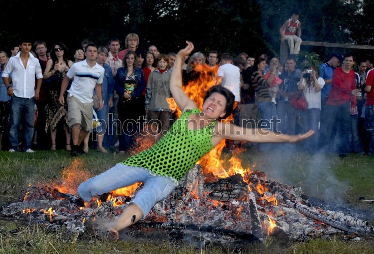 Женщина упала в купальський огонь во время праздника Ивана Купалы в Киеве, в воскресенье, 6 июля 2008 г. Каждый год в ночь с 6 на 7 июля отмечается праздник Ивана Купала. Ночь на Купала самая короткая, этой ночью никто не должен спать. Девушки плетут венки из трав и пускают их на воду (от того, куда поплывет венок зависит судьба девушки, если венок утонет, значит, суженый разлюбил и замуж за него не выйти). Все ищут цветущий папоротник, который по преданию раскрывается только на несколько мгновений в полночь на Иванов день и дает возможность нашедшему его повелевать миром, угадывать будущее. Ночь на Купала невозможна без очищающих костров. Вокруг них пляшут, через них прыгают - кто прыгнет лучше и выше, тот будет счастливее. Считается также, что огонь укрепляет взаимные чувства - поэтому прыгают и парами. Фото Олега Гордиенко / УНИАН
