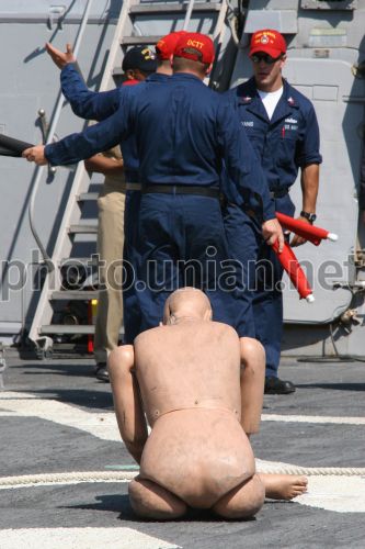 Члены экипажа эсминца ”McFaul” отрабатывают навыки по спасению людей в рамках учений “Си Бриз-2008”, в Одессе , во вторник, 15 июля 2008 г. Накануне состоялась церемония открытия учений “Си Бриз - 2008”. Главной целью нынешних маневров “Си Бриз-2008”, которые проходят в Одесской и Николаевской областях и АР Крым, является отработка стандартов НАТО действий многонациональных штабов и сил во время планирования и проведения миротворческой операции. В учениях примут участие военнослужащие из 17 стран мира. В частности, Австрии, Азербайджана, Бельгии, Великобритании, Армении, Греции, Грузии, Дании, Канады, Латвии, Македонии, Румынии, США, Турции, Украины, Франции и ФРГ. В этом году маневры “Си Бриз-2008”, которые традиционно проводятся в рамках программы НАТО “Партнерство совета мира”, будут длиться до 28 июля. Фото Алексея Сувирова / УНИАН