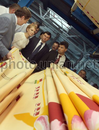 Премьер-министр Украины Юлия Тимошенко знакомится с производством тканей на предприятии ОАО “Тернопольское объединение “Текстерно”, в Тернополе, в четверг, 17 июля 2008 г. В рамках однодневной рабочей поездки главы правительства в Тернопольскую область прошло совещание относительно состояния и перспектив развития легкой промышленности Украины, на котором присутствовали руководители предприятий этой отрасли. Премьер пообещала, что правительство в течение недели разработает план первоочередных мер относительно улучшения состояния легкой промышленности страны. Фото Александра Прокопенко / POOL / УНИАН