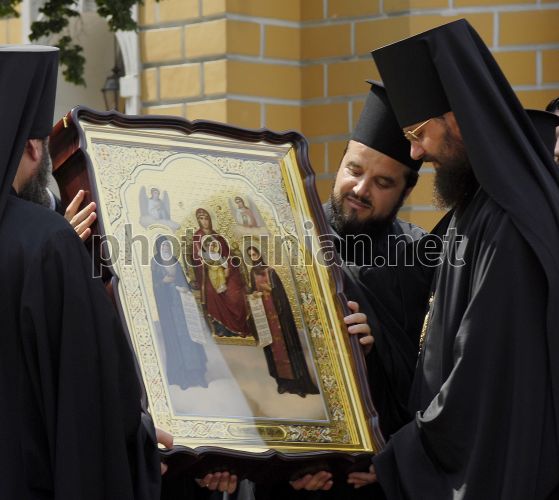 Священнослужители целуют икону в день приезда Вселенского патриарха Варфоломея I в Киево-Печерской Лавре, в Киеве, в пятницу, 25 июля 2008 г. В этот день в рамках торжественных мероприятий по случаю 1020-й годовщины крещения Киевской Руси Варфоломей I и Владимир совместно провели молебен и обменялись приветствиями и подарками по случаю праздника. В мероприятии также приняли участие представители делегаций зарубежных церквей, которые прибыли в Украину на торжестве по случаю 1020-й годовщины крещения Киевской Руси, и правительственные чиновники. Фото Олега Гордиенко / УНИАН