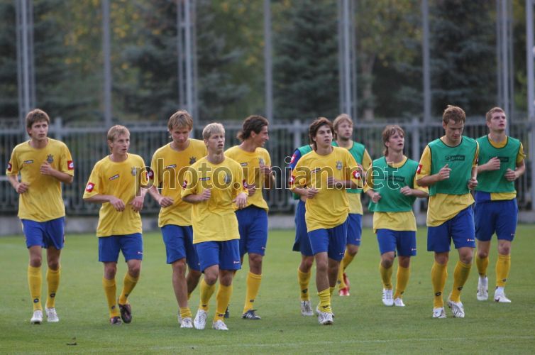 Игроки молодёжной сборной Украины по футболу во время тренировки на спортивной базе в Конча-Заспе в понедельник,18 августа 2008 г.
