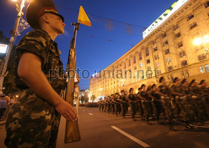 Военнослужащие маршируют на репетиции военного парада ко Дню Независимости Украины в Киеве, во вторник, 19 августа 2008 г. Парад войск, посвященный 17-й годовщине Независимости Украины, состоится 24 августа на Майдане Незалежности в Киеве с привлечением военной техники и авиации. Фото УНИАН