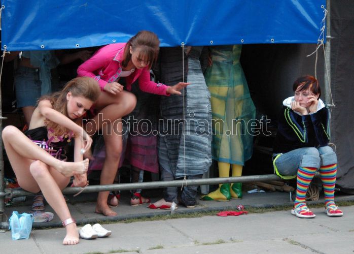СОММ Молодой дизайнер Федоруца Елена (справа в углу) наблюдает за моделями за сценой во время фестиваля "Перлини сезону", который уже шесть лет подряд проводится в Запорожье, в субботу, 16 июля 2005 г. Федоруца Елена представляла коллекцию "Панки Викинги " на конкурсе молодых дизайнеров-модельеров "P.S. Fashion" в перый день фестиваля, 15 июля 2005 г.