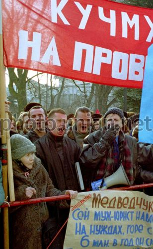 Сторонники парламентского меньшинства выкрикивают противоправительственные лозунги под плакатом с надписью "Кучму на провода", пикетируя здание Верховной Рады Украины в Киеве во вторник, 8 февраля 2000г. Более 300 представителей левых партий приняли участие в пикетировании, организованном Прогрессивной социалистической партией Украины (ПСПУ), требуя отмены решений, принятых парламентским большинством на заседаниях в "Украинском доме".