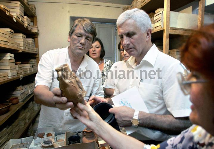 COMM Президент Украины Виктор Ющенко, слева, и премьер-министр АРК Анатолий Матвиенко осматривают археологические находки в Национальном заповеднике "Херсонес Таврический" в Херсонесе, Крым, во вторник, 16 августа 2005 г. Во время посещения заповедника Ющенко предложил создать научный совет, который бы разработал концепцию создания музея-заповедника "Херсонес Таврический" в соответствии с современными стандартами. Президент также выступил с идеей инициировать создание фонда "Друзья Херсонеса", цель которого - изучение этого уникального исторического объекта.