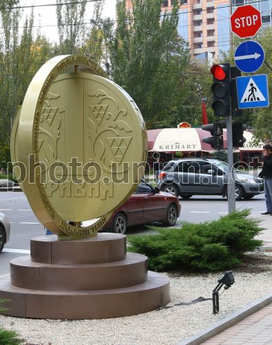 Декоративная композиция около главного управления «Проминвестбанка», в Донецке, в среду, 1 октября 2008 г. В связи с распространением ложной информации о банкротстве финансового учреждения, жители Донецкой области за три дня сняли со счетов ”Проминвестбанка” от 180 до 200 миллионов гривен (от 36 до 40 миллионов долларов). У здания областной дирекции банка собиралось по несколько сотен человек, которые пытались досрочно закрыть депозиты и обналичить зарплатные карточки. Некоторые крупные банки были вынуждены заблокировать авторизацию карточек ”Проминвестбанка” в своих банкоматах и закрыть на него межбанковские лимиты. В настоящее время проводится расследование, кто и каким образом распространял информацию о банкротстве банка. Фото УНИАН