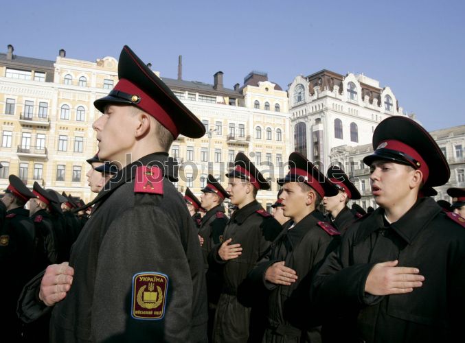 Курсанты во время церемонии возложения цветов к памятнику Богдану Хмельницкому по случаю празднования Дня украинского казачества и праздника Покровы Пресвятой Богородицы и Приснодевы Марии в Киеве, во вторник, 14 октября 2008 г. Фото Михаила Маркива / POOL / УНИАН