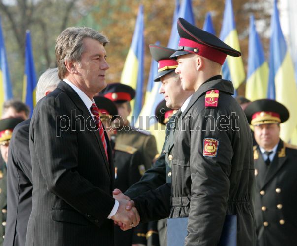Президент Украины Виктор Ющенко, слева, здоровается с курсантами во время церемонии возложения цветов к памятнику Богдану Хмельницкому по случаю празднования Дня украинского казачества и праздника Покровы Пресвятой Богородицы и Приснодевы Марии в Киеве, во вторник, 14 октября 2008 г. Фото Михаила Маркива / POOL / УНИАН
